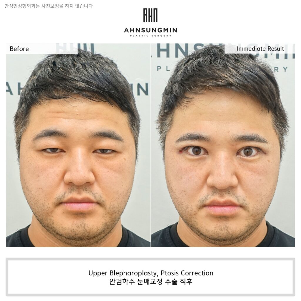 As you can see the before and after pictures below, his pupil is fully shown after the surgery. And he no longer raises his forehead when opening his eyes.