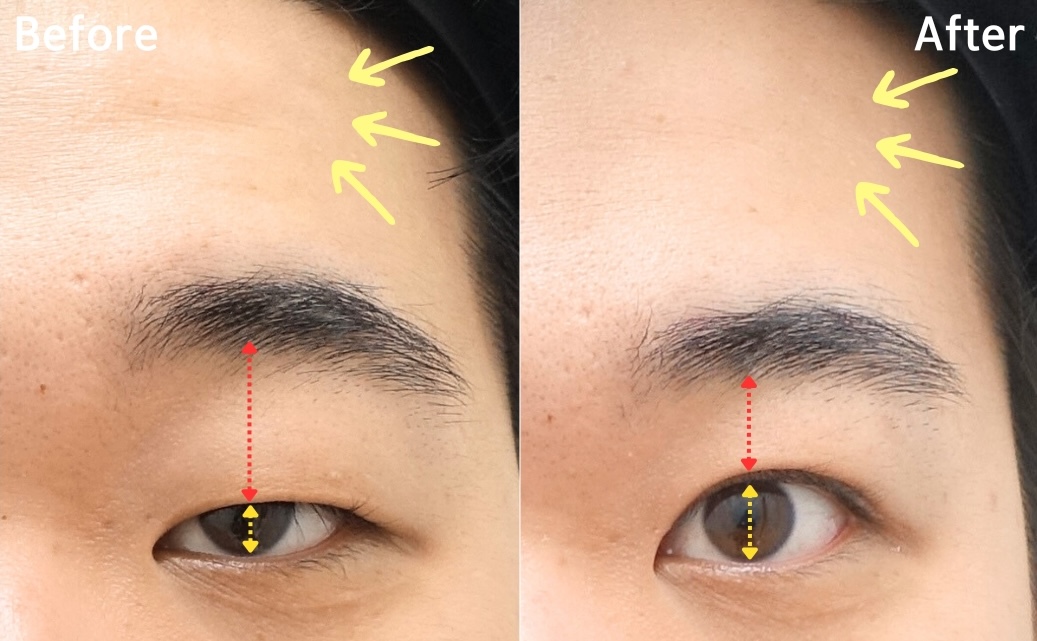 Before surgery, the patient relied excessively on the forehead to compensate for weakened eyelid function. After surgery, eyelid opening becomes more balanced, reducing the need for compensatory muscle use.